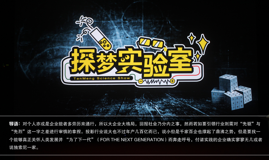 在另一方面,“索尼探夢(mèng)”這一工程亦是彰顯索尼在數(shù)碼、IT、音視頻等領(lǐng)域的頂尖技術(shù)與產(chǎn)品的平臺(tái),作為國(guó)內(nèi)首部4K科普影片《探夢(mèng)實(shí)驗(yàn)室》在“索尼探夢(mèng)”館內(nèi)正式上映。自2014年11月15日起,每個(gè)周末來(lái)到“索尼探夢(mèng)”參觀的客人,都能免費(fèi)觀看到這部4K科普實(shí)驗(yàn)影片,在學(xué)習(xí)趣味科學(xué)的同時(shí),領(lǐng)略超高清4k技術(shù)帶來(lái)的視覺(jué)盛宴,感受4K影像技術(shù)的超凡魅力。