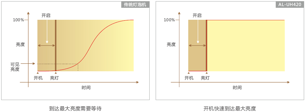 | AL-UH420 提供即時(shí)開/關(guān)機(jī)功能。開機(jī)瞬間即達(dá)到全數(shù)亮度,并且無須冷卻即可瞬間關(guān)機(jī)。面對(duì)突發(fā)的停電,斷電,人為操作失誤等,