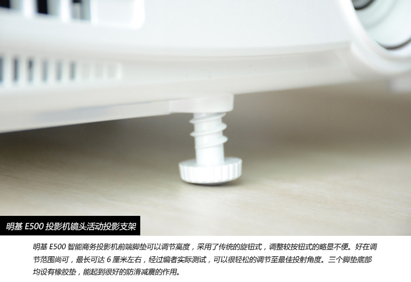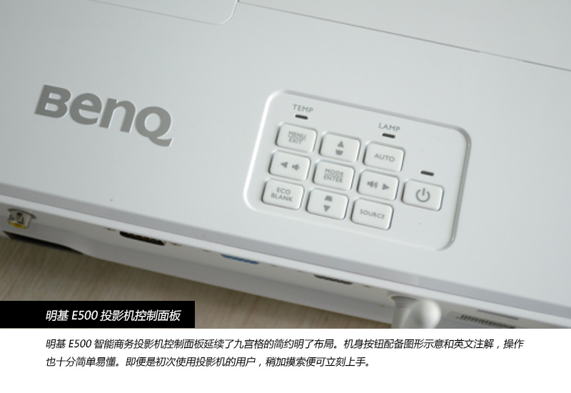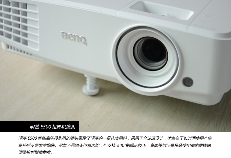 雖然從體積明基 E500不屬于微投,但是其體重僅僅1.9千克, 大小283 x 95 x 222 mm ,輕便的體積無論是隨身攜帶又或者是桌面投射都非常便利。明基E500采用DLP投影技術,標稱亮度為3300流明,對比度為13000:1,分辨率為1024×768。搭載196瓦高效節能燈泡,在智能省電模式下可以達到6500小時的使用壽命。