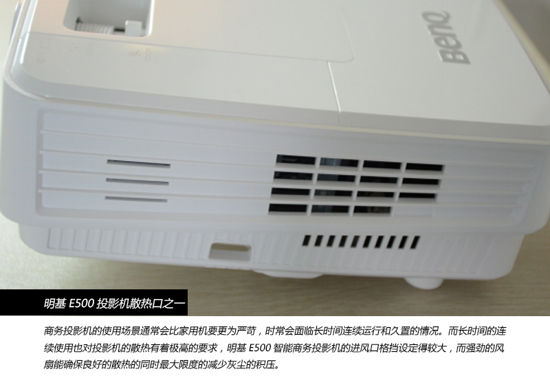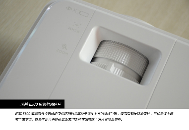 從外觀設計來看,明基E500智能商務投影機沿用了其商務系列的一貫風格。采取的是經久耐看的純白經典色調,仔細觀察它的上蓋也是別有一番設計感的,整個上蓋整體為光滑面,而調焦輪附近的單獨塊被設計成了有細條紋的磨砂面,整個上蓋在視覺上使整個機器顯得更為有設計感。