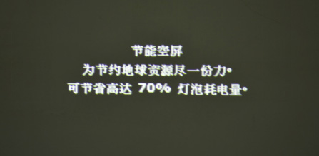 在企業日常會議及商務洽談中,演示PPT等等商務文件是必不可少的環節。前面有提到明基E500在節能管理上的出色表現,但是這里又要提到一個不僅僅是節能的小細節,而且在演示中非常實用的一個功能,那就是遮屏功能。不知你有沒有這樣的經歷,當你的演示過程中話題已經跳離了PPT,但是下面的人眼睛依然盯著投影幕,這個時候如果演示者希望聆聽者將眼睛集中在自己身上,遮屏功能就可以來實現它的價值了。演示者只需輕輕一按遙控上的遮屏按鍵,整個投影畫面將立即“收起來”,整個畫面只剩“節能空屏,為節約地球資源盡一份力,可節省高達70%燈泡耗電量”。不得不感嘆明基E500處處顯示出其 “環保心”。遮屏功能不僅使下面人的注意力轉移在演示者身上,同時也為用戶節省了能耗。