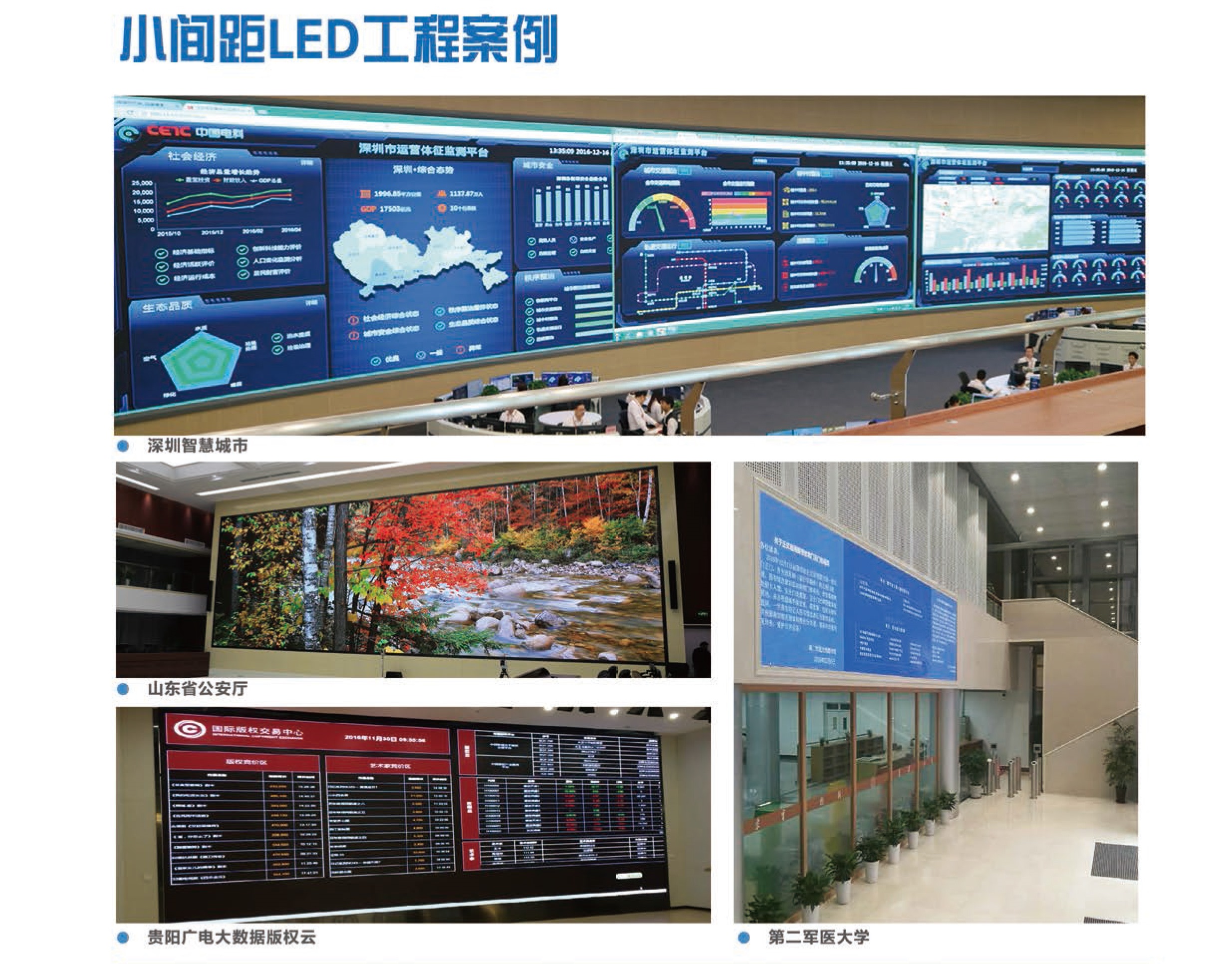 基于小間距LED 顯示技術的拼接顯示系統具有無拼縫、亮度高、色彩柔和、對比度 高、圖像響應速度快的特點,可為各類信息監控及信息處理提供一個無拼縫、全數字 化、高分辨率的信息窗口,成為信息可視化系統理想的展示平臺。