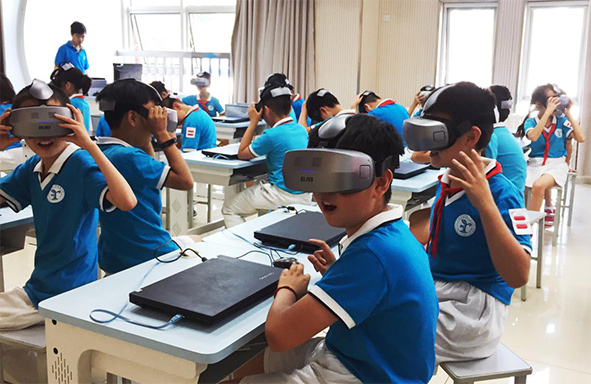 超感課堂包括學生端VR一體機、教師端主控設備、教育資源云平臺、充電車。學生端可以通過VR一體機進入到全沉浸、可交互、開放式的教學虛擬環境,進行全感官體驗式學習。教師端可以利用主控設備自主編輯虛擬現實課件、選擇教學內容、把握教學進度、管控學生、收集學習大數據等。虛擬現實教育云平臺上有語文、數學、英語、科學、地理、生物、物理、化學、歷史、地理、美術、音樂等三百多節學科課程,這些課程緊扣國家教學大綱,此外還有與中央電教館、安全產業協會、Discovr、NASA等合作的安全、航空、自然、國學等科普內容。