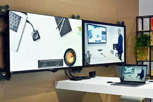 據現場工作人員介紹,如今在許多大型會議室、報告廳等應用中,單屏顯示很難滿足用戶多種信息同步顯示的需求。由此,奧拓電子推出SID150雙拼屏,可呈現雙拼、全屏、居中三種顯示模式,且可在三種模式間一鍵切換。展會現場演示了其三拼用法,即左右兩側顯示標語,中間顯示視頻。這種新穎的應用方案吸引了許多觀眾的駐足。