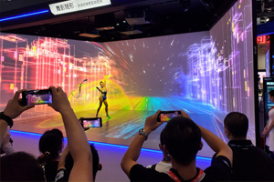 走進中科極光展廳,海底巨鱷迎面而來,似乎要沖出畫布。真實震撼的裸眼3D效果,帶觀眾步入神奇的光影世界。視角從海底進入森林,借助智能軌道鏡系統,一只貓頭鷹從樹枝“穿越”到了窗口,時而停留,時而飛翔,在展覽空間中270度盤旋,觀眾視線跟隨貓頭鷹的軌跡,感受“造夢空間”中的各個展示亮點。隨著軌道鏡的旋轉,地面出現“互動游戲”的文字提示,揭開簾幕進入賽博朋克的律動空間。這是中科極光重點打造的沉浸式交互空間,五臺投影儀將三面墻體和地面組合成一個沉浸式的娛樂空間。