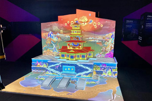 創意展區帶來的是一場迷人的中國風實景演藝3D投影秀,它在一座長 6 米、高 3 米的仿古塔樓模型上進行。這場投影秀配置了四臺專為中國市場研發的 20,600 流明科視Christie DWU2022-HS 1DLP® 激光投影機、科視Christie 潘多拉魔盒以及科視Christie Mystique。該投影演示突顯了科視Christie 集成解決方案的優勢,是最近在廣州和南京的路演中的明星展項。在展會上,該投影秀無論從設備配置和演示內容,都進行了重大升級,讓大家耳目一新。